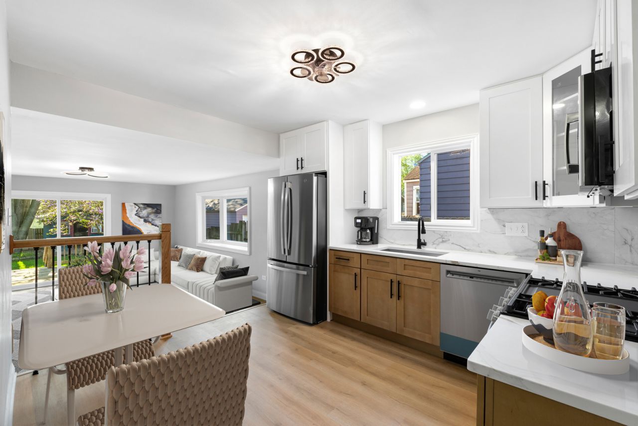 Completely reimagined from top to bottom. The striking exterior features fresh white vinyl siding, bold black trim, a paver walkway, and a cedar-ceiling covered entry. Inside, enjoy an open-concept layout with luxury vinyl plank flooring, a stunning stacked-stone fireplace with live-edge mantel, and a fully updated kitchen with shaker cabinets, marble-look backsplash, and stainless steel appliances. The spa-inspired primary bath is a true showstopper - black marble porcelain tile, frameless glass walk-in shower, penny mosaic floor, and designer matte black fixtures. Two additional bedrooms with vaulted ceilings and a second full bath. Sliding doors lead to a large deck with pergola overlooking a fully fenced backyard.