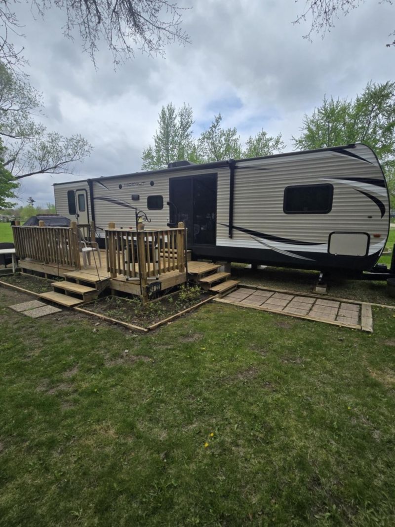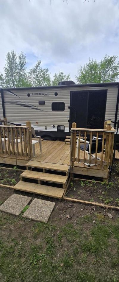 This lovely listing package begins with a sizeable flat lot with extended utilities. The lot has common ground on the side as well as a large area of common ground in the back. Located close by is a walking trail that leads to the beach, pool #2, Woodhaven Lake and many more amenities! Included is a fully furnished beautiful and modern 2018 Keystone Hideout Luxury Series 38 FQTS. This beauty includes 3 slides, 2 full bedrooms (upgraded mattresses), 1.5 baths. Step out onto the deck and relax/throw some burgers on the grill. A charming fire pit area to gather around and partake in some marshmallows and conversation. This lovely package will surely not last long-call for a showing quick! Gated facility-must be accompanied by a Real Estate Broker to view listing. Property owner is responsible for yearly assessments. This is not a homestead property.